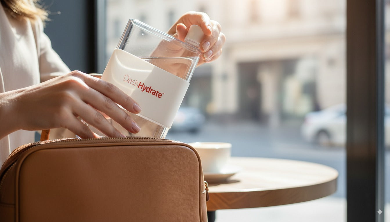 Flat Water Bottle for Travel: Meet the DashHydrate flat water bottle, your perfect on-the-go hydration companion. With a slim A5-sized design, it slides effortlessly into your bag, purse, or laptop case, making it ideal for travelers, gym-goers, and busy commuters.